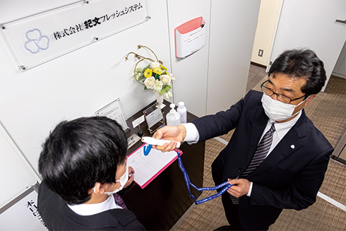 本社では、時差出勤・在宅勤務の実施、職場でのアルコール散布、お客様への検温を伴った健康状態チェックのお願いなどを実施しています。