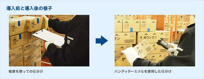 私たちは、仕分け作業にハンディターミナルを活用することで、作業を簡素化し経験の浅い作業者でもミスなく作業ができる環境を整備しました。また、このシステムを導入することで、管理者は仕分け作業の進捗をパソコン画面で把握することができるようになりました。
